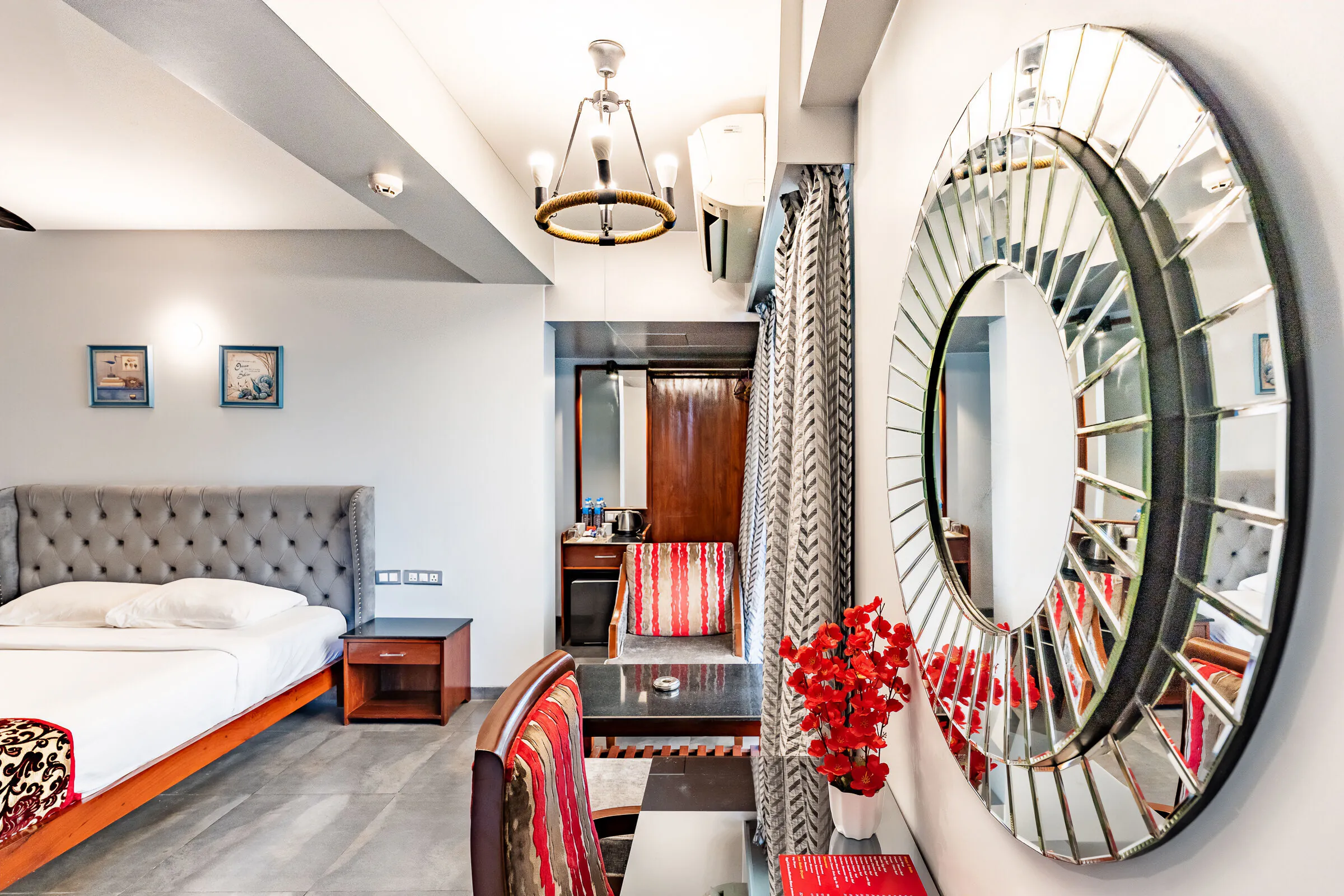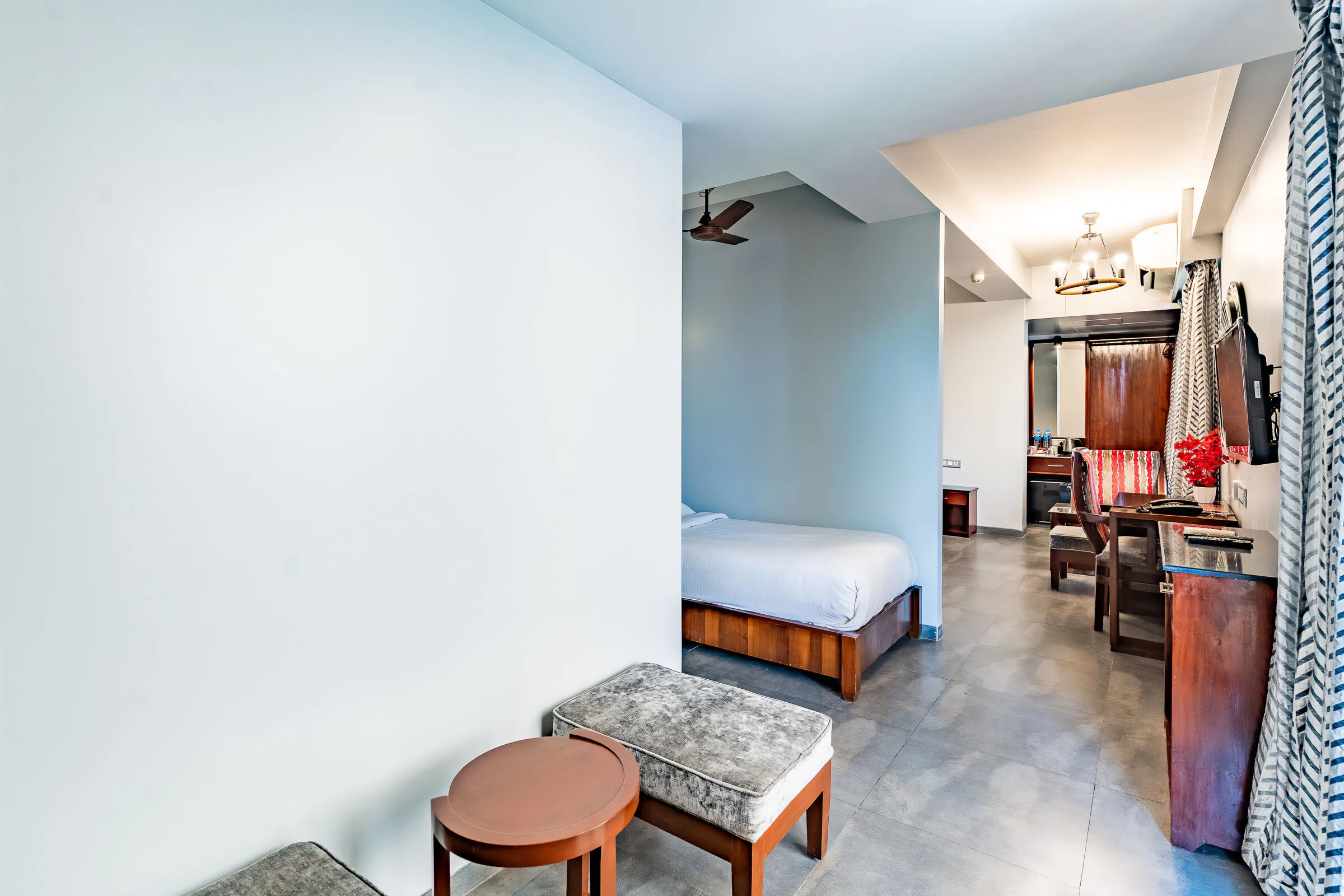 The Master Suite is Zense Resort's most luxurious accommodation, offering a massive 1000 sq. ft. private terrace for outdoor lounging and dining. The suite features a king-size bed, a single bed, two attached bathrooms, and premium amenities — making it ideal for families and groups.